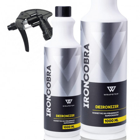 Iron Cobra od firmy Wrapster to preparat o neutralnym pH. Szybko i skutecznie rozprawia się z zabrudzeniami pochodzenia metalicznego z felg i karoserii. Niezwykle skutecznie usuwa brud z klocków hamulcowych na felgach i lotną rdzę. Podczas pracy środek mocno "krwawi", co świadczy o tym, że wszedł w reakcję z zabrudzeniami i o skutecznym działaniu. Środek nie ma przykrego zapachu, który bardzo często możemy spotkać w deironizerach, co sprawia, że praca z nim jest przyjemna.