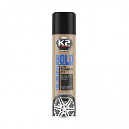 K2 Bold to szybki i łatwy w użyciu środek przeznaczony do nabłyszczania i konserwacji opon. Przywraca oryginalny wygląd, nadaje lśniący połysk i głęboką czerń. Chroni przed promieniami UV, pękaniem oraz matowieniem. Dzięki właściwością hydrofobowym ogranicza osadzanie się zabrudzeń. Może być używany również do nabłyszczania i konserwacji innych powierzchni gumowych oraz plastikowych.
